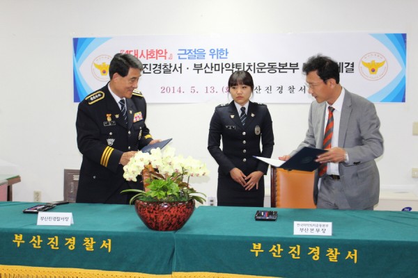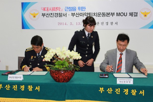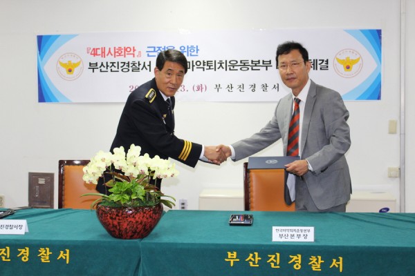 부산진경찰서와 한국마약퇴치운동본부 부산지부가 상호 협력하여 4대 사회악 근절을 위한 업무협력식이 5월 13일 부산진경찰서에서 이루어졌다. 이날 각 기관은 상호 신뢰와 존중을 바탕으로 성폭력, 가정폭력, 학교폭력의 가해자 혹은 피해자들 중 마약 및 기타 약물남용자에 대한 치료 및 예방업무 지원을 공동 수행함으로써 건강가정 회복과 사회복귀를 통한 서민생활 안정에 기여하고 민.경 협력체제 구축을 목적으로 업무협력식이 이루어졌다.