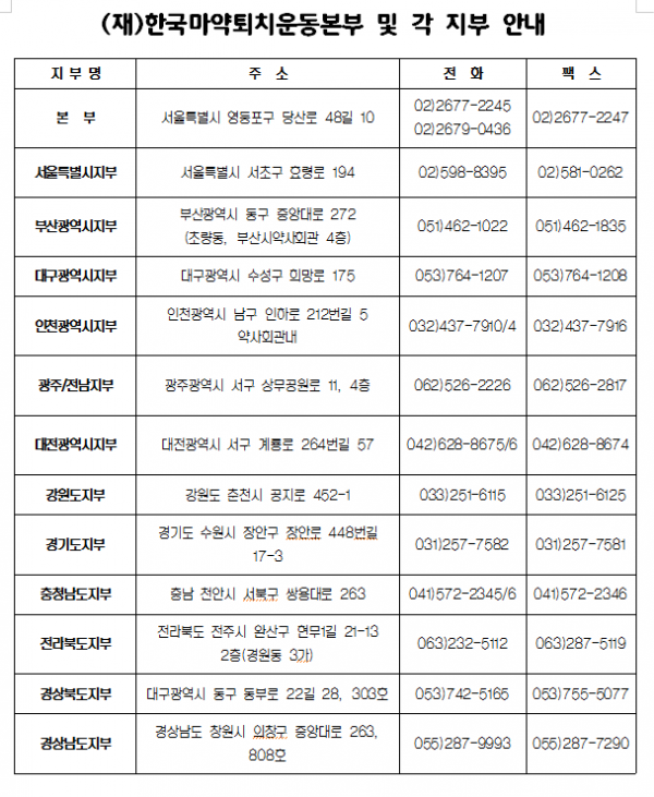 한국마약퇴치운동본부 전국지부안내